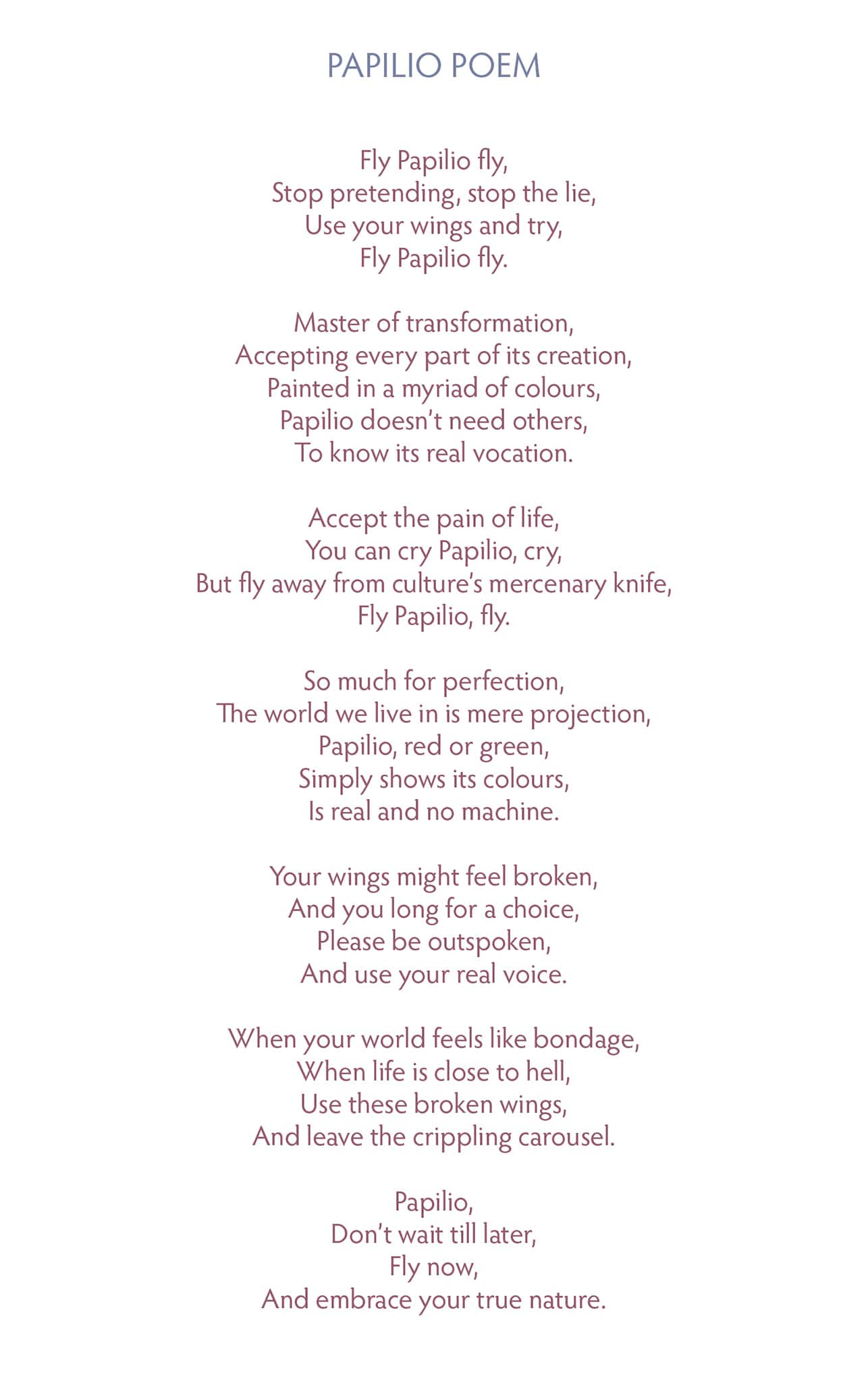 Butterflies don’t suffer from ‘good’ advice from parents, friends, influencers, cosmetic clinics etc. and simply accept themselves as they are in each phase of their life.